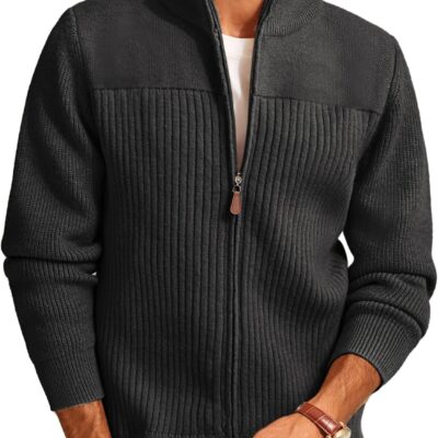 Men’s Full Zipper Cardigan Casual Stand Collar Cardigan Sweater Ribbed Knit Long Sweater