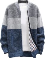 - Design: Classy Cardigan, Casual Knit Cardigan. Stripe pattern knit sweater zipper cardigan. full zip up sweater design in slim , stand collar, long , ribbed cuffs and hemline.You can pair this cable-knit cardigan sweater with stylish denim pants or casual pants,they are amazing menswear items to add to your current casual collection.Perfect choice for your daily life,keep warm and stylish in cooler days.