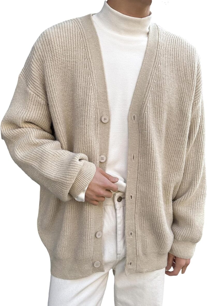 Men’s Casual Long Button Front V Neck Rib Knit Cardigan Sweater