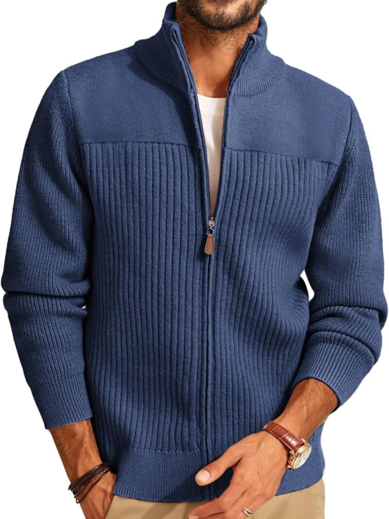 - STYLISH DESIGN: This men’s cardigan sweater features long s, a stand-up collar, and a ribbed knit textured design. The smooth metal front zipper of the men’s cardigan allows you to adjust the way you wear it at will; the stand collar adds utility to the sweater and will keep your neck warm in cold weather; the stylish ribbed texture adds sophistication and modernity to this cardigan, keeping you stylish without looking bulky in winter